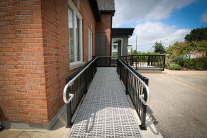 A newly constructed accessibility ramp designed to provide safe and easy access for wheelchairs, walkers, and strollers.